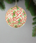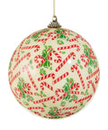 A wonderful spin on a vintage ornament, this ball ornament is an off white color adorned with small red candy canes tied off with green bows and holly leaves!