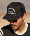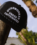 The unisex unstructured vintage style trucker cap features "Overworked Under Caffeinated" embroidery, and a rope across the visor. The front panels of the hat are made of brushed cotton twill and includes an adjustable plastic snapback closure.
