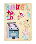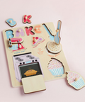 Wooden puzzle with knob handles features hinged, mirrored and spinning details for pretend play with a baking theme.