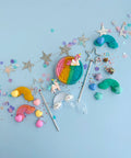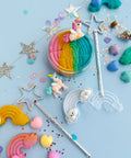 Includes: 8 oz Four Layered "Rainbow In a Jar" (Rainbow sherbet) KidDough, 2 Unicorn Figurines, Rainbow Form, Cloud Form, Smiling Cloud Charms, Pastel Star Charms, Jar of Butterfly Glitter and a 5" Magical Star Wand