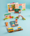 10-piece play set includes rolling buses, blacktop road, standing chalkboard, playground equipment, and hopscotch board. Promotes imaginative play, creativity, and social interaction