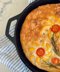 Dr. Pete's Italian Herb Focaccia skillet bread mix is ready in a little over an hour. Just add water, olive oil, and let it rest for 1 hour and it is ready to meet that cast iron skillet. Bake at 450 for 20-25 minutes. You will have a crisp bottom and top, with a deliciously moist and chewy middle.