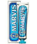 Marvis Aquatic Mint Toothpaste pairs a sweet and refreshing touch of mint with the cool freshness of the sea – the perfect combination to protect teeth, freshen breath, and help prevent tooth decay, tartar, and plaque.