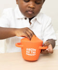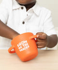 The Happy Snacker is a first-of-its-kind two-piece silicone snack cup with a mess-proof snap-tight lid and soft silicone opening so little hands can easily access food and prevent spills. Designed with easy-grip handles, it fits in car seats and stroller cup holders.