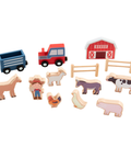 The Farm Wood Toy Set is a 13-piece set that allows your child to create their own farm scene. Crafted from high-quality pine wood, this set is designed to withstand the test of time. It includes a tractor and trailer, a farmer figure, two fence posts, a barn, and seven charming animal figures.