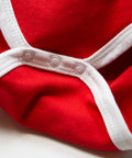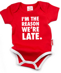 This playful red cotton baby onesie features the cheeky screenprinted phrase "I'm The Reason We're Late," perfect for little ones who love to keep their parents on their toes. Soft and comfortable, it’s an adorable way to celebrate the fun chaos babies bring to everyday life.