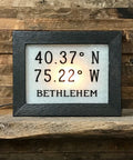 This Bethlehem Coordinates lighted sign will make a statement in your office, library, or living area! Wood frame finished with an aged black finish holds frosted glass with vintage style lettering.