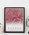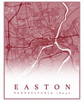 This listing is a print featuring an original design by artist Michelle Bold. The artwork includes a map of Easton Pennsylvania in red. The artwork measures 8x10 inches and arrives flat and ready to frame. The artwork is printed using archival inks, which won't fade over time, on fine art linen paper.