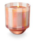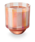 A multicolor striped glass votive plays vessel to this luxury plant-based candle which then sits inside a giftable box featuring a vibrant design.