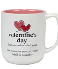 Celebrate love with a wink and a smile. This ceramic mug features a cheeky Valentine's Day definition that'll get laughs over morning coffee or tea. Perfect for couples with a sense of humor, or anyone who appreciates witty wordplay. Durable ceramic construction keeps your favorite beverages at the ideal temperature while you enjoy the clever reminder of what February 14th really leads to. A fun gift for anyone who loves a good laugh.