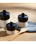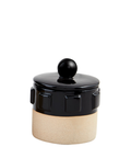This striking stoneware canister brings artisanal charm to your kitchen or shelf. Crafted from glazed and exposed stoneware, it features a finial lid and a captivating contrast of deep black and warm beige tones. The casual yet elegant design makes it equally at home storing pantry essentials or displaying as a standalone accent piece. Perfect for adding a touch of earthy, handcrafted character to any space.