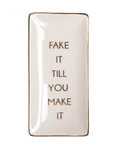 Add a touch of humor and elegance to your space with the Fake It Till You Make It Trinket Tray. This white ceramic tray features chic gold metallic accents, perfect for holding your jewelry or small essentials. Its playful message makes it a witty gift that inspires confidence and style every day.