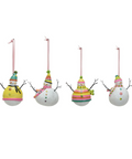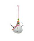 Make your holiday decor extra merry and bright with this whimsical snowman ornament! Featuring colorful attire and a pink velvet ribbon, it adds a touch of non-traditional fun to your festivities. Spread the holiday cheer with this unique and playful decoration.