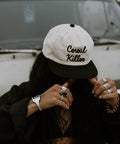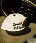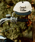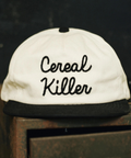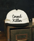 The unisex unstructured vintage style cap features the "Cereal Killer" pun written in chainstitch. The hat is made of brushed cotton twill and includes an adjustable plastic snapback closure.