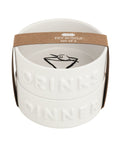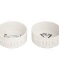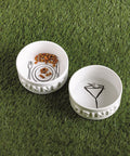 Keep mealtime entertaining with this whimsical pet bowl set! Each bowl features a charming martini glass or dinner plate graphic on the interior, while "Drinks" and "Dinner" are debossed across the exteriors for a sophisticated touch. Perfect for the stylish pet parent who refuses to compromise on personality, this set brings a splash of fun to feeding time. Your furry friend will dine in style.