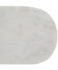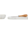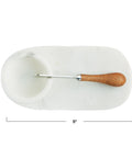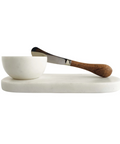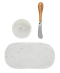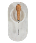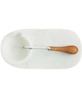 Our Blanc Marble Serving Set features a board that is perfect for a variety of foods, such as cheese, crackers, meats, fruits, nuts, and more. It includes a matching bowl that can hold dips, sauces, or olives, and a mango wood & stainless steel canape knife that can cut and spread cheese with ease. The board has an oval shape that adds character and charm to the table setting.
