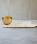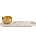 Our Coronado Marble Tray + Tidbit Set features a sophisticated design, perfect for serving and displaying a variety of foods. The natural marble surface provides a cool, smooth texture ideal for cheese, charcuterie, or desserts. Accompanying the tray is a charming tidbit dish crafted from tin with a luxurious brass finish, adding a touch of opulence to any setting. This set combines functionality with a touch of luxury, making it a stylish addition to any kitchen or dining setting. The unique veining of the marble ensures each piece is one-of-a-kind.