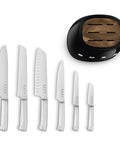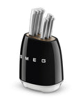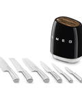 Elevate your culinary workspace with this refined SMEG knife block set, where timeless design meets everyday functionality. Six precision-forged stainless steel blades—vegetable, utility, meat, santoku, bread, and chef's knives—deliver versatility for any preparation task. The iconic block features a sophisticated black finish with polished chrome accents and warm acacia wood detailing, creating a striking focal point that bridges vintage aesthetics with modern kitchen sensibilities.