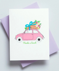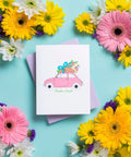 A part of our Moto greeting card series, this sweet illustration is of a Fiat 500 (an homage to the famous red Fiat in the courtyard of the Parisian store "Merci") topped with a giant bouquet of flowers.