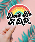 This playful vinyl sticker serves as a colorful reminder to not be a dick. With a rainbow design, it adds a touch of fun to any surface. Don't be a dick and get this sticker now!