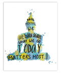 This listing is a print featuring an original design by artist Michelle Bold. The print features the inspirational quote "Each morning, we are born again. What we do today matters most" by Buddha. The quote is hand drawn over a watercolor style background in the shape of Gautama Buddha in blue and yellow. This artwork makes a great gift for those who practice meditation or Buddhism, yoga lovers, or a great accent to a serene space.