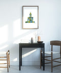 The artwork measures 8x10 inches and arrives flat and ready to frame. The artwork is printed using archival inks, which won't fade over time, on fine art linen paper.