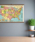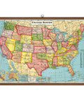 Decorate your home or office with vintage charm. This poster-sized vintage style map of the United States will remind you of the maps which used to hang in nearly every school classroom. Antiqued wood hanging bars at top and bottom feature a metal hanging loop already attached.