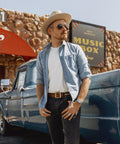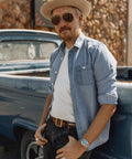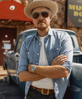 Made from a midweight cotton, this chambray button up shirt is washed and pre-shrunk for a soft finish with a unisex fit. Includes a distressed finish for a wore in look and features a front button closure.