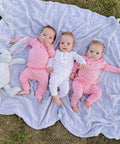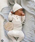 You're going to love this baby outfit! Made from the same soft and stretchy material as our swaddles and gowns this top and bottom outfit and hat set will be your new favorite baby attire. This white color is perfect for baby girls and baby boys. This is the perfect "coming home outfit" with room to grow!